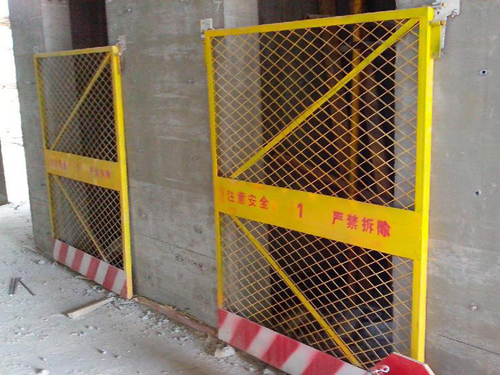 電梯井口防護門全部由鋼結(jié)構(gòu)組成。鋼材采用國家標(biāo)準(zhǔn)材料,制作嚴(yán)格按圖施工,尺寸正確,焊接點牢固,達到安全防護之目的,電梯安全門采用檸檬黃色,門下部檔架板采用黃、黑間隔。電梯井口防護門是建筑施工現(xiàn)場預(yù)防人身傷害必備的防護設(shè)施,它適用于各類建筑施工工地。